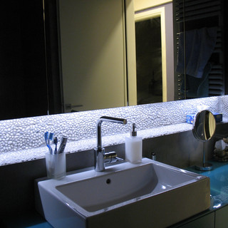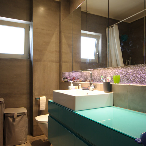 The couple decided to renovate the space according to their own aesthetics and needs. We concluded in replacing the kitchen furniture and the wardrobes of the three bedrooms, where the bathroom and WC were fully reconstructed. Part of the project were also the lighting design of specific spaces of the flat, the study of the new electrical and plumping installations and the colourations of the rooms. A new bookcase was designed and constructed in the living room, a little while after the flat was inhabited.